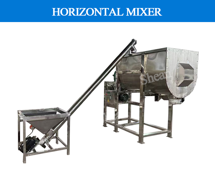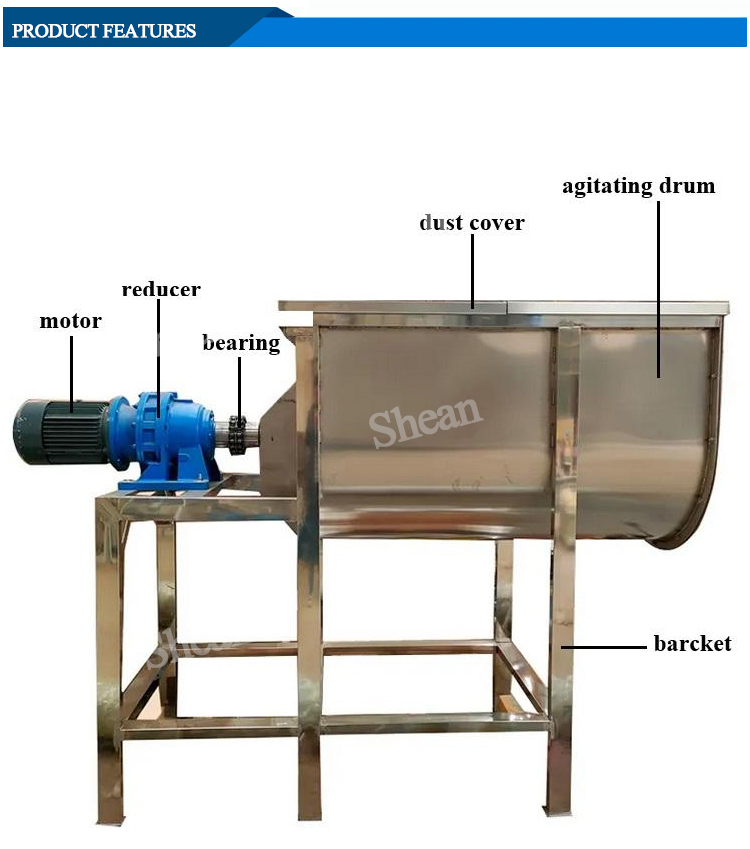 Horizontal ribbon mixer mixing blade is usually spiral belt type, 360 degrees double S-type, able to circulate along the axial and radial stirring of the material, so that the material in a short period of time to obtain rapid and uniform mixing, uniformity can be as high as 99% or more.
